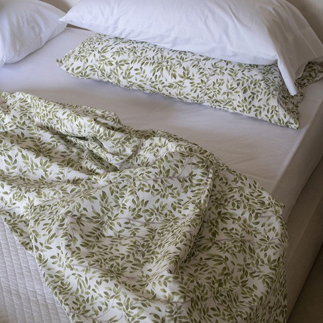 Llençol de cotó percal de 180 fils, amb estampat de petites fulles de color verd. Confeccionada a Portugal.
